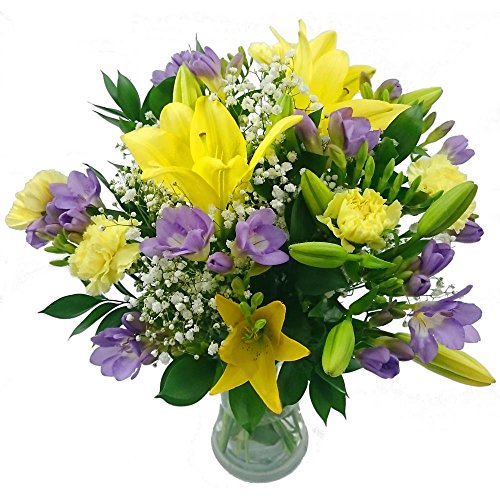 FRESH FLOWERS: A bouquet of fresh lilac freesia and yellow lilies along with carnations and gypsophila