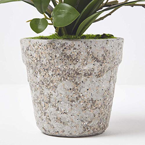 Purple artificial orchid from Homescapes. Potted in a light grey cement pot, designed to replicate the popular Phalaenopsis orchid species. Total Height: 42 cm Tall. Pot Height: 13 cm. Colour: Purple.